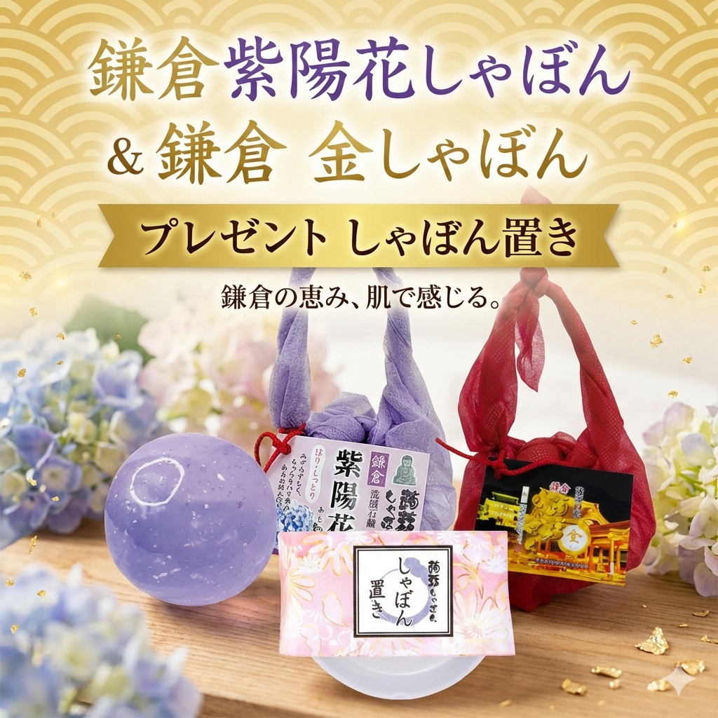 鎌倉で人気の紫陽花しゃぼんと金しゃぼんをセットにしました。